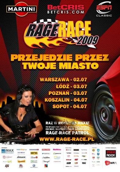 Rage Race 2009 - 2-4 lipca ponad pięćdziesiąt załóg przez trzy dni na trasie pełnej zmagań, przygód i adrenaliny. Bez względu na kraj i kontynent, nigdzie nie brakuje osób zafascynowanych pięknymi autami z temperamentem i dużą liczbą koni mechanicznych. Każdy mężczyzna (ale nie tylko) lubi poczuć nutkę rywalizacji i dobrze się bawić. Wychodząc na wprost oczekiwaniom, na bazie zachodnich doświadczeń, od 2007 roku organizowany jest w Polsce Rage-Race. Wyjątkowy event motoryzacyjno-lifestyle’owy wielopłaszczyznowym współzawodnictwem pomiędzy uczestnikami rozgrywany na terenie Polski raz do roku w okresie letnim.