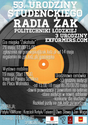 53 godziny audycji na 53. Urodziny Studenckiego Radia Żak Politechniki Łódzkiej! Od 15.00 w piątek 18 maja do 20.00 w niedzielę 20 maja zapraszamy na prawie trzy doby muzyczno-lirycznych, ekstatycznych wrażeń!