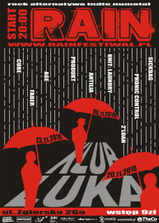 Od 6-20 listopada czeka nas kolejna edycja FESTIWALU RAIN, którego celem jest promocja młodych, utalentowanych zespołów muzycznych z województwa łódzkiego. Daje on szanse pokazania się na scenie i zdobycia doświadczenia estradowego. Poza tym stworzony jest on dla wszystkich miłośników ciekawego, nowego brzmienia. RAIN to skrót od głównych gatunków muzyki jaka zostanie zaprezentowana podczas koncertów - ROCK, ALTERNATYWA, INDIE, NUMETAL. Na koncertach nie będziecie tylko słuchać muzyki, ponieważ organizatorzy przewidzieli wiele dodatkowych atrakcji.